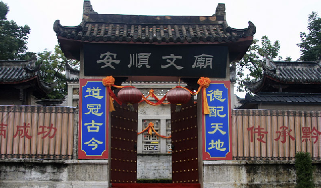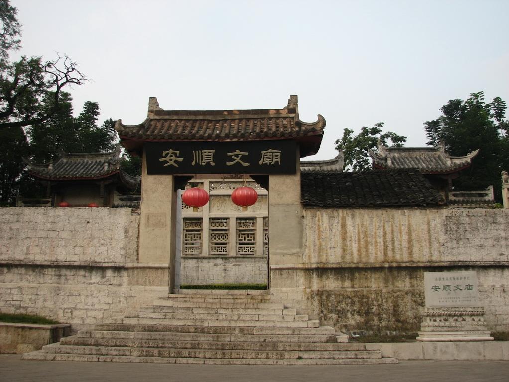 安顺文庙始建于明代洪武初年(约公元1368年),天启二年(公元1622年)毁于兵燹,天启上年(1624年)重建。后经清康熙七年(1668年)、康熙五十五年(1716年)、道光十七年(1837年)几次增建、修复,臻于完备,现存建筑22处。占地约8000平方米,1982年,贵州省人民政府核定公布为省级文物保护单位。史载安顺文庙始建于明洪武初年(1368年),后几经修复增建,逐渐完备,成为一处占地约11亩,沿中轴线依次抬升对称分布的,是一座规模宏大、布局严谨、庄严典雅的古建筑群。建筑群。
