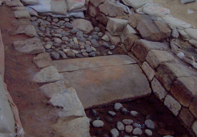发掘工作从8月1日开始,至11月结束,发掘面积450平方米,在距地表深约4.5米处清理出一座大型石构水池的西南一角。水池呈仰斗状,池壁用灰白色的砂岩石板呈密缝冰裂纹铺砌。池底平正,用碎石铺砌。在已发掘探方的东北角处,还有一大型的叠石柱向西南倾倒,由于太靠近一幢5层高的楼房,无法扩方发掘究明。水池当中还散落有大量的八棱石柱、石栏杆、石门楣、“万岁”瓦当和板瓦、筒瓦等建筑材料和构件,可知水池当中原来是有一组建筑的。后经钻探得知,版权所有山东聊城聊之旅国际旅行社有限公司,转载必究!水池的面积约4000平方米,目前揭露的仅是其西南约400平方米的一角。