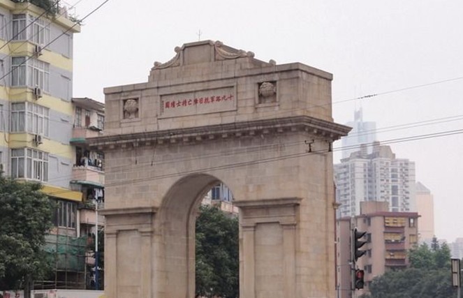 陵园有一座花岗岩砌成的仿罗马纪功式建筑凯旋门。门楼建于1932年,位于沙河顶、先烈路和水荫路的交会处,高13.4米,宽 11米,占地面积 40.7平方米。门额正面镌刻着原国民政府主席林森所题的“十九路军抗日阵亡将士坟园”,背面镌刻国民政府行政院长宋子文题写“碧血丹心”。