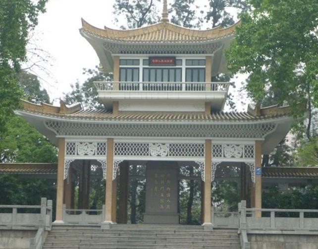 中朝人民血谊亭位于广州起义烈士陵园内东面,与中苏人民血谊亭相对。建于1964年,坐南朝北。建筑平面呈“凹”字形,占地面积约3000平方米。黄色琉璃瓦,钢筋混凝土结构。主亭面阔三间12.85米,进深三间13.06米,高二层,四角攒尖顶。上悬“中朝人民血谊亭”匾额。两侧各有总长为33.7米的曲尺型长廊,两廊各连接面阔6米,进深5.5米的卷棚歇山顶副亭,平面呈方形。中国传统形式的建筑基座,带有朝鲜民族风格的屋脊和檐口装饰为金达莱花和木棉花结合的图案。亭前是水池,小桥横跨其中。亭中心矗立着高大的花岗岩石纪念碑,碑座高0.96米、碑身高 4.3米、阔2.6米,上嵌红棉图案。纪念碑正面刻“中朝两国人民的战斗友谊万古长青”, 版权所有山东聊城聊之旅国际旅行社有限公司,转载必究!落款为“叶剑英”,题于“1964年十月一日”。背面镌刻着著名书法家吴子复书写的碑文,对在广州起义中牺牲的朝鲜青年的事迹作了简明的介绍。