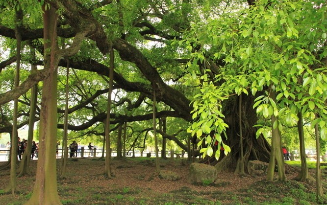 大榕树苍老古朴,周围阡陌如织、小河清澈、渡口静待、山峰环绕。已有1400多年高龄的隋代大榕树,树围有七米多,高达十七米,独木成林,静穆凝重。盘根错节,如同蟒绕龙盘,浓荫遮天,只有丝丝缕缕阳光从缝隙中钻入。