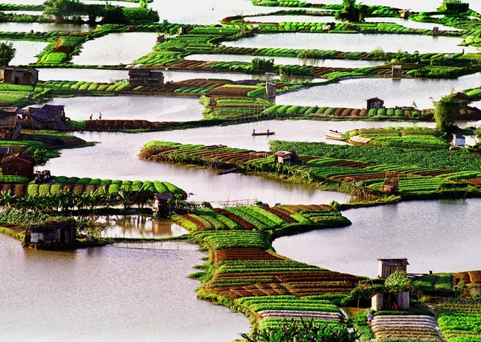 古劳堤内水网纵横交错,小艇穿行如梭,两岸蕉林摇曳,万亩鱼塘似明镜耀目,千顷桑地绿海翻波,那青青的田畴就像精雕的翡翠,好一派旖旎的南国水乡风光。