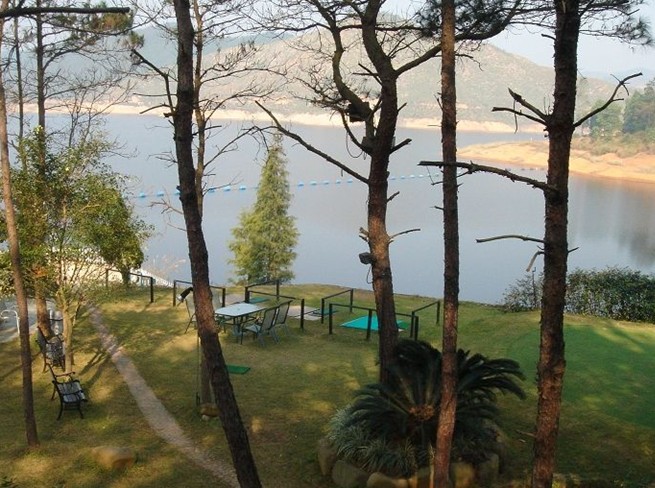 河东名人山庄的高尔夫球练习场就建在湖边的悬崖上,挥动球杆,小小的高尔夫球成抛物线状优雅地降落在碧绿的湖水里,这种妙不可言的感觉吸引了我们这帮从来没有接触过高尔夫球的门外汉。球场旁边有一片松树林,林中设有秋千和吊床,睡在吊床上,静静地透过高高的松树看着洁净如洗的蓝天白云,只见远处山顶一堆蘑菇云慢慢地被风吹着一路往山庄方向飘来,由厚变薄、由浓变淡,渐渐地变成羊毛般的云絮,随着温暖的春风飘舞浮动,直至飘散、消融。在乒乓球台前、网球场里,经过一轮大汗淋漓的运动之后,再跳进了碧绿的游泳池,一种清凉舒适的感觉必定涌上心头。