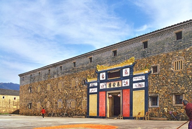 梅州泰安楼的建筑风格独特,规模宏大,设计精巧,布局合理,功能齐全,文化内涵丰富。从外表上看简直不相信这会是住宅建筑,其极其封闭的外观简直像一座牢不可破的城堡。高大的泰安楼给人的第一印象是磐石般的稳重、质朴、粗犷。走进泰安楼,以祖堂为中心的“祖功宗德”横匾,显示了敬祖的思想和客家人对传统的依恋,展现了客家人世代相传和睦共居的独特的生活方式,这种大家族聚居的建筑体现了客家人的族群意识,泰安楼向心的布局强化了家族内部的凝聚力。