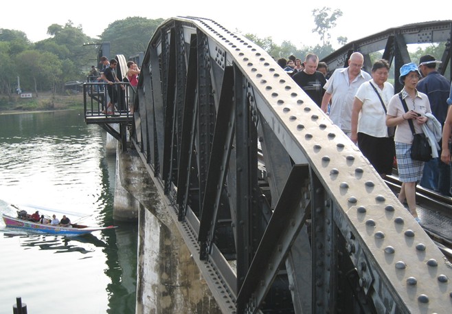 桂河大桥原为木桥,几经飞机轰炸,早已毁坏,只有在河水很浅时才能看到残迹,现在我们看到的是后来修建的铁桥,它今天还在通车。重建后的桂河大桥,在原来桥的两侧圆弧铁架多出了两段不协调的方形铁架,没有原先圆弧铁架的优美,很多看过的人觉得不伦不类、不搭调。桂河大桥大约10分钟就可以走完,过了桥就是一般的死亡铁路,一直前行可以通到缅甸。站在桂河大桥的桥头,看着夕阳下静静流淌的美丽桂河,使人难以想象这里发生过的悲惨故事,只有安放在桥头的美军投下未爆炸的炸弹提示着我们当年那场惨烈的战争。