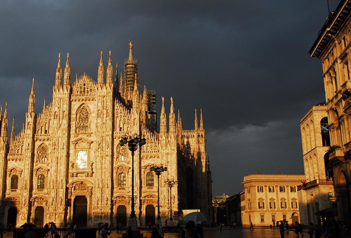 米兰大堂是世界上最大的哥特式建筑,有“米兰的象征”之美称。主教堂始建于1386年,由米兰望族吉安•维斯孔蒂主持奠基。1500年完成拱顶,1774年中央塔上的镀金圣母玛丽亚雕像就位。1813年教堂的大部分建筑完工。1897年最后完工,历时五个世纪。1805年拿破仑曾在米兰大教堂举行加冕仪式。至1965年教堂正面最后一座铜门被安装,才算全部竣工。