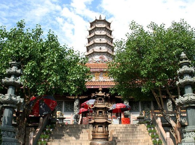 据清光绪《嘉应州志》载,由南汉王刘鋹始建于大宝八年(公元965年),距今已有一千多年历史。铁塔分为七层,身高4.2米,呈四方形,塔底边长1.6米,为生铁铸成,每面铸有大小佛像250个,四面合计为一千佛,故名千佛塔。原塔建于修慧寺,因寺毁,清乾隆初年嘉应州官王者辅将铁塔移于梅城东岩山顶,上面盖亭宇,周围筑栏杆,并砌石阶,以供游览者登临观赏。梅州千佛塔与广州光孝寺的东西铁塔是同一历史年代的遗物。梅州千佛塔按每一面计算,第二层有77尊佛、第三层67尊佛、第四层57尊佛、第五层37尊佛、第六层12尊佛,合为250尊佛,版权所有山东聊城聊之旅国际旅行社有限公司,转载必究!四面共计满千佛。第四层的佛像中,四面各有一尊大佛坐在莲花池座上,它们是东方善德佛、南方施坛德佛、西方无量寿佛、北方相德佛。第七层是合尖顶,塔旁建有黄遵宪的《南汉修慧寺千佛塔歌》、丘逢甲的《南汉敬州修慧寺千佛塔歌》等碑刻,是广东省重点文物保护单位。