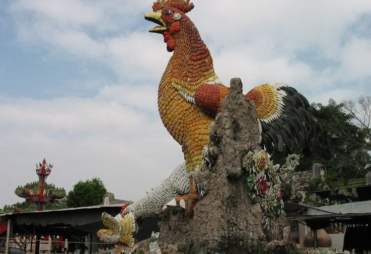 岛上最高处立有观世音菩萨巨型石雕像,高12米,由大小105块石雕砌成,从海湾大桥上过往时皆可望见。
