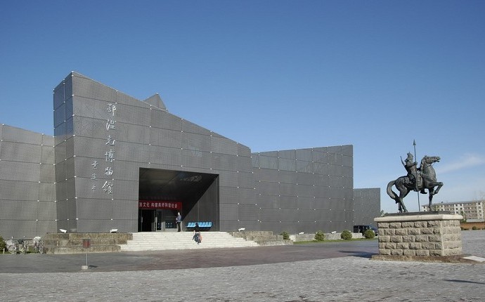 鄂温克博物馆正门前身着盔甲、手持武器骑在骏马上的鄂温克民族英雄海兰察的铜像。扬蹄的骏马、坚毅的表情显示出了海兰察将军安内如鹰、攘外似虎的赤胆忠心和高超的武艺及鄂温克人的骁勇善战,保家爱国的精神。