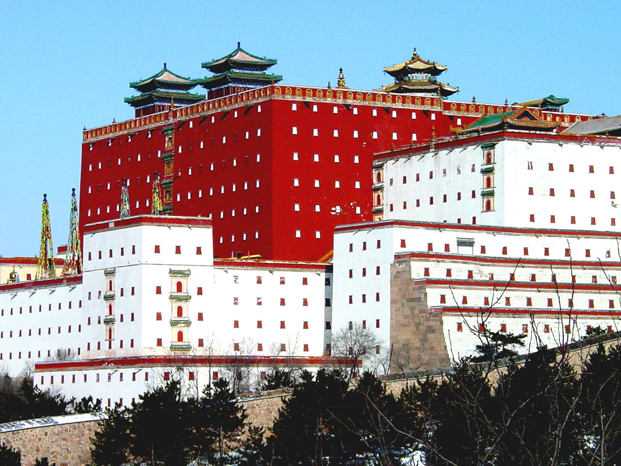大红台南、第一部分两侧散置30余座大小白台,成“×”形不规则布置。白台分殿台、楼台、敞台、实台,形状不一,体量不等,功能各异。层高一至四层,二、三层者居多,大都白灰抹面,青砖镶边红色盲窗,琉璃砌顶,版权所有聊城聊之旅国际旅行社有限公司,转载必究!上檐挑出淌水长瓦。白台为藏式平顶碉房形制,建筑用汉族砖混结构法式。有的两座白台组合成一处院落作僧房;有的台上建汉式殿堂,作佛堂、钟楼使用;有的台顶置舍利塔;有的白台砌成实心,只起障景增景及点缀作用。白台群总体效果表现了西藏布达拉宫前山脚下梵字的特征。南部宫墙两头分置角楼,实墙白台砌盲窗,顶部起雉堞。宫墙两侧白台中间辟门,上起庑殿,对称配置,供僧人进出使用转经桶。