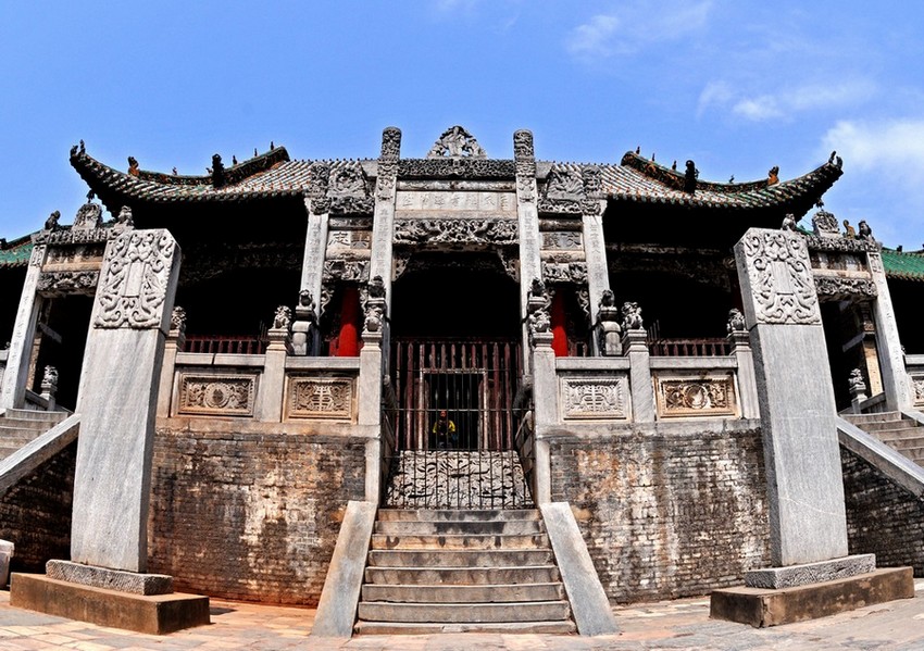 会馆座北向南,聊城旅游网版权所有聊城聊之旅国际旅行社有限公司,转载必究!占地面积约7750平方米,地面全部用一尺见方的青白石板铺砌,现存殿、堂、楼、阁及各种建筑130余间。主体建筑由琉璃大照壁、悬鉴楼、大拜殿、春秋楼四部分组成,自南向北呈现中轴线式分布。前为琉璃照壁、铁旗杆 、东西辕门和东西马厩;其后为悬鉴楼、钟鼓楼、东西廊房;再后为大拜殿、药王殿、马王殿;最后为春秋楼。布局严整,庄严肃穆。除后部“春秋楼”被毁外,其余保存尚好,是河南省古建筑中一个比较完整的建筑群,也是南阳市面积较大、保存较为完整的古建筑群之一。会馆的前部是巨大而又华丽的“二龙戏蛛”浮雕照壁,高20米,宽13米,聊城旅游网版权所有聊城聊之旅国际旅行社有限公司,转载必究!仿北京“九龙壁”建造,用彩釉陶瓷大方砖砌成,透花雕龙,图案精巧,构图艺术,金碧辉煌。悬鉴楼,又名“八卦楼”,为会馆之戏楼。楼高30米,面阔17米,进深20米。建于嘉庆元年(1796年),重檐歇山式建筑,上下三层,翬飞斗拱,层层叠立;环楼上下,均有木、石雕刻;戗脊上饰以人物走兽,雕工精细,玲珑奇观。楼两侧有钟、鼓二楼作陪衬。钟、鼓二楼皆用十六根木柱支撑;东楼悬大钟,西楼悬大鼓。钟、鼓楼两侧,有东西辕门和马厩。大拜殿为会馆的中心,楼高34米,面阔23米,进深45米。建于同治八年(1869年),大殿建在高台之上,为重檐庑殿式建筑。后殿原有“暖阁”,内有关羽牌位。前殿为宴会厅,雕梁画栋,富丽堂皇。殿檐下木刻“西游记”、“封神榜”等图案,雕工精巧,形象逼真。殿前两侧,各有大石雕,高五余尺,采用浅浮雕与透雕相结合的雕法,右壁石刻“渔樵耕读”,山水亭台、人物、鸟兽,雕琢精细,布局严谨;左壁石刻“十八学士朝瀛洲”,雕造工巧,内容丰富,形象生动。殿下所筑高台,约四余米,砖、石包砌,周围以石栏,中立一石雕牌坊,精雕细镂“金龙缠玉柱”、“文武狮子”、“八爱图”;牌坊下为“九龙口”,斜铺云龙石雕;牌坊两旁立门楼,筑台阶各十三级。大殿左右筑以陪殿,东为药王殿,西为马王殿;陪殿之前,均建有东、西廊房各十三间,把大拜殿烘托得更加雄伟、肃穆、壮观。会馆的建筑结构和雕刻艺术,集中体现了我国古代建筑艺术和独特风格,被誉为我国的古建明珠,是河南省保存较完整的一处古建筑群,成为著名的游览胜地,1988年被列为国家重点文物保护单位。