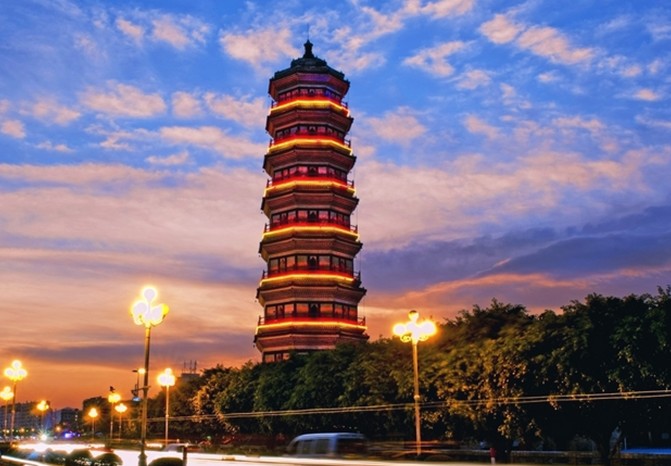 崇禧塔始建于明万历十年(1582年)九月,由岭西副使王泮兴建,万历十三年(1585年)四月竣工。因西江水“滔滔而东,其气不聚,人才遂如晨星”,若建塔聚 气,可使人才辈出;又因西江水患频仍,建塔可镇住“祸龙”,永固堤围,于是有造塔之举。而塔名,则取“文运兴旺”、“鸿福无疆”之意。它屹立于塔脚路北侧 的石顶岗上,巍峨壮观,气势非凡,堪称四塔之冠。崇禧塔 位于肇庆市塔脚路石顶岗。堪舆家认为西江水“滔滔而东,其气不聚,人才遂如晨星”,若在石顶岗建塔,可使人才辈出。塔外观比例均匀协调,每层塔檐均用绿色琉璃瓦铺盖,檐角悬挂风铃,铃声嘹亮悦耳,塔腔内底层至五层砌有佛龛,过去,龛内供奉泥塑佛像。从乾清门进入塔内,循级登塔,左右盘旋,每至平座,可凭栏远眺,四周景物,尽收眼底。塔刹用铁铸的覆盆、宝珠、紫铜葫芦装置,金碧辉煌。塔为楼阁式砖塔。为八角九级,内17层,高57.5米。基座为石砌,高1.84米、周长46.5米。其八角均有石雕“托塔力士”。力士像之间有二龙戏珠、鲤跃龙门、双凤朝阳、麒麟献瑞等浮雕。该塔比例匀称,自下而上逐层减高与收分。每层腰檐用琉璃瓦铺盖,檐角悬挂铜风铃,共72个。塔楼板为木质,各层平座均有木护栏。底层至五层均有佛龛,其中首层外3个,二至五层明、暗层共46个。各层门洞为圭形券门,版权所有山东聊城聊之旅国际旅行社有限公司,转载必究!由西北方向的乾清门进入塔内,逐层穿壁绕平座盘旋直至顶层。1960年和1983年该塔进行维修,恢复了楼板、平座、瓦檐、栏杆等,并增建外围墙。由赵朴初撰书“崇禧塔”匾和“七星高北斗,一塔耸南天”的对联镶嵌于山门之上。1962年7月广东省人民委员会公布为文物保护单位。