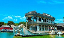 夜幕降临,什刹海里还有不少游船,点点船火,阵阵琴声。什刹海的摇橹船是仿照“清明上河图”中的船形打造的,古色古香。游客在北海公园北门对面荷花市场码头上船,由头戴斗笠、身着黄色短衣的船夫摇船,船上点起古老的马灯,船头怀抱丝竹乐器的小姐弹拨出轻柔动听的民间乐曲。橹船穿过古老北京著名的景观“银锭桥”,游客饮茶小吃,同时观赏两岸丰富的人文景观和民俗生活景象。最为精彩的是日落日升,船行什刹海后海,游人点起蜡烛纸河灯放入水中,灯浮水面沿船尾浮动,忽明忽暗灿烂一片。版权所有聊城聊之旅国际旅行社有限公司,转载必究!丝竹声中岸上游人驻足观看,船上游客畅饮尽兴……
