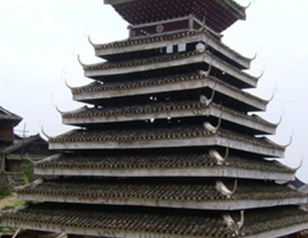 苗族鼓楼在台江县城东南方20公里的排羊乡九摆村上寨中间,楼旁古木参天,苍翠绿郁。 鼓楼为三重檐歇山顶屋面,木结构建筑,覆盖小青瓦,其 下层呈平面四方形,空间宽敞。楼高11米,占地52平方米,整 个建筑结构以中间独柱为中心,周围16根外环檐柱为衬。利用 逐层内收的粱、枋、瓜柱、檐柱支撑挑出屋檐。结构无一钉一 铆,撵横穿斜插,衔接紧密牢固。前后留进出通道。左右柱外 、设置美人靠坐栏,供人坐息。其用料粗大,结构严谨、工艺精湛,经风雨数百年,巍然不动。版权所有山东聊城聊之旅国际旅行社有限公司,转载必究!楼中地面设有一直径约23厘米 的地鼓,在举行祭祀仪式时才用,是时击鼓而众人围舞,故称鼓楼。为至今发现唯一存留的苗族鼓楼。