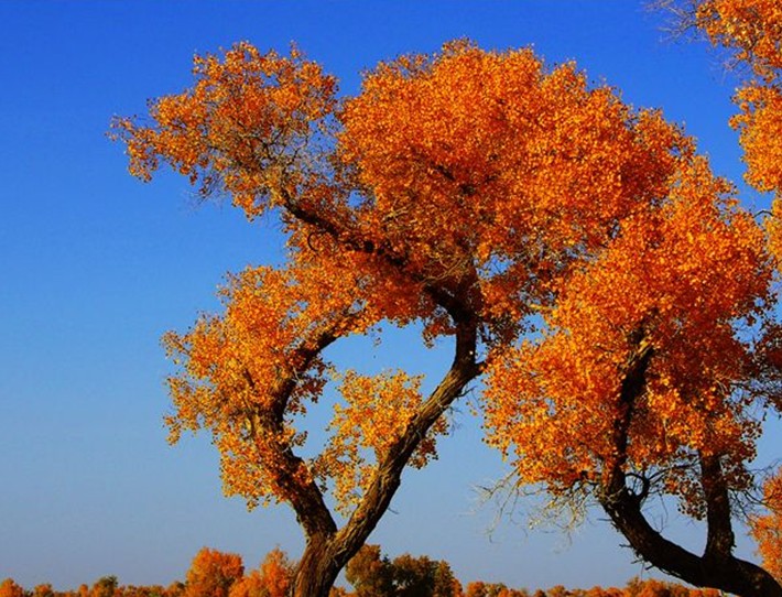 在我国巴音郭楞自治州最长的内陆河塔里木河,分布着世界唯一的最大原始胡杨森林公园保护区,全世界胡杨林有百分之十在中国,而中国的胡杨林有百分之九十在新疆塔里木河畔。它的祖先远在一亿三千五百万年前早就出现了,被地质学家称为“第三世纪活化石”是世界上最古老的一种杨树。