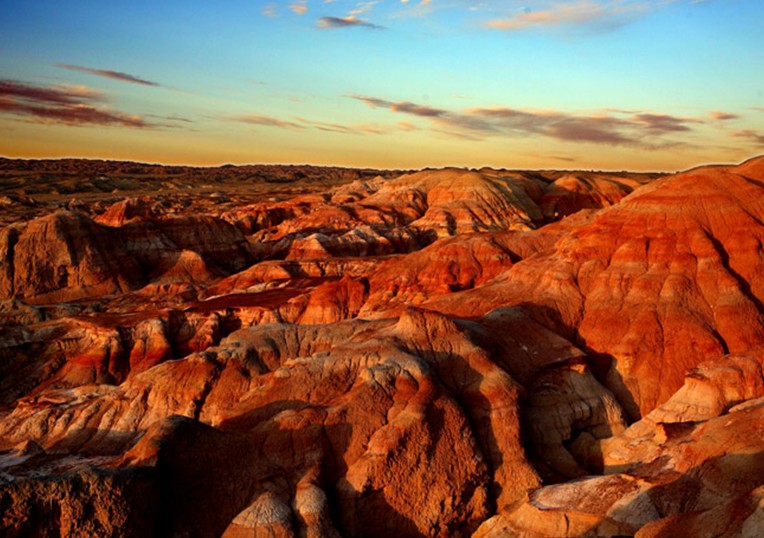 阿勒泰五彩城北距富蕴县城约280公里,海拔约650米。阿勒泰五彩城外观属丘陵地形,是受风力和流水作用形成的侵蚀台地,高一般10――20米,最高约50米,分布面积近10平方公里。 一般由倾角不大的侏罗纪地层构成的阿勒泰五彩城,岩画凹凸相间,岩石色泽多变,以红为主,间以绿、黄、白、黑及过渡色彩,酷似五彩古堡。阿勒泰五彩城与乌尔禾魔鬼城的雅丹地貌相比更具有良好的视觉效果。