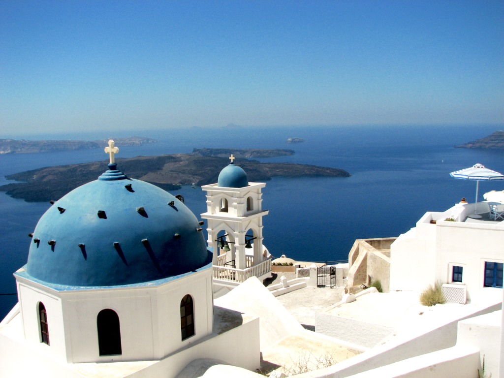从米克诺斯岛乘船到圣特里尼岛约需5小时航程。来到以后,才知道很多观光手册和旅行社都把米克诺斯岛和圣特里尼岛作为推荐给游客的首选,是不无道理的。我们的油轮刚靠岸,大家就惊奇地发觉,海边陡峭的山崖呈红褐色,山崖的顶端是一片白色的房屋,小巧明丽。据说,该岛位于世界两大大陆板块最深的海沟之间,原来是圆形的。3500年之前的一次火山爆发,岛屿被震出一个大洞,一大块月牙形的就成了主岛,周围还有几个小岛,其中一个小岛纳亚卡美尼至今还是活火山。