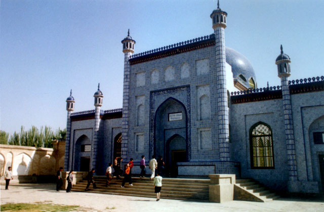 礼拜殿为平顶,主墓室是绿琉璃圆顶;而且其东部建筑中所用塔楼(邦克楼)甚多,约10余座,为新疆同类建筑中少见;塔楼的制作精美可观,也是建筑装饰。整个建筑群高低相间,主次分明,形成一完整的群体。墓室外墙以蓝底白花琉璃砖贴面,礼拜殿木柱的雕刻花纹古拙奇特,纹样丰美,与一般制作方法不同,都是新疆伊斯兰建筑中难得的精品,为后世所罕见,体现出古代维吾尔工匠的高超技艺和杰出才能.