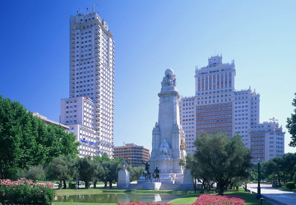 市内现代化的高楼大厦与风格迥异的古建筑摩肩并立、相映生辉。树林、草坪和各种造型别致的喷泉和雕有古代小亚细亚人尊崇的自然女神尼贝莱塑像喷泉最吸人入胜。宏伟的阿尔卡拉门坐落在阿尔卡拉街头的独立广场上,共有5道拱门,是马德里著名的古建筑之一。财政部、教育部和西班牙的主要银行坐落在阿尔卡拉大街两侧,建于1752年的王家美术学院收藏着牟利罗和戈雅等西班牙美术大师的名作。巍峨的塞万提斯纪念碑耸立在西班牙广场上,碑前有堂吉诃德和桑科•潘扎的塑像,巨大的碑身倒映在前面的水池之中,碑两侧是葱郁的树木;有“马德里塔”之称的西班牙摩天大厦位于广场一侧。