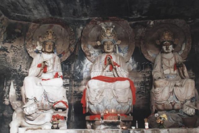 三壁三龛佛殿窟: 有南三、五、七、北三。窟分前廊后室(南七、北三)面阔为三间四柱,明间正中开窟门,次间各开大龛,龛内雕踏山力士像,明间上部为印度式拱,次间额枋上为一斗三升拱。版权所有山东聊城聊之旅国际旅行社有限公司,转载必究窟檐雕出仿木结构建筑形式的滴水、圆椽、筒瓦等,瓦垅上有八层叠涩基,基上浮雕大型山花蕉叶覆盖窟顶,大蕉叶拥托覆钵丘,丘上雕出象征塔刹的双层火焰宝珠。窟内平面方形、穹隆顶,正、左、右壁各开帷幕帐形龛,龛内雕一铺三尊(南五)、五尊(南七)、七尊(北三)像,窟顶浮雕莲花藻井及飞天伎乐,地面浮雕大莲花,莲花中间置博山炉(南五)窟门两侧刻大番卷草纹和连珠纹,上部刻飞天。