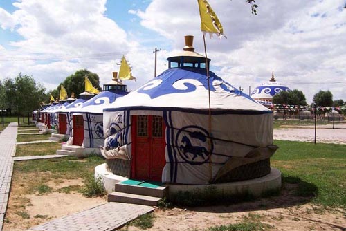 四、赛马、摔跤、射箭场:从餐饮住宿部向东南行走500米,到蒙古族娱乐活动的中心,赛马场,每年的那达慕大会就在这里召开。在高天的主席台两侧,排列着阶梯形的观礼台。周长两公里的封闭式赛马道开阔平坦。骑手们穿着五彩缤纷的民族服装,在赛道上飞奔,游人们情不自禁的跨上骏马加入到赛马的行列,一表骑马风采。