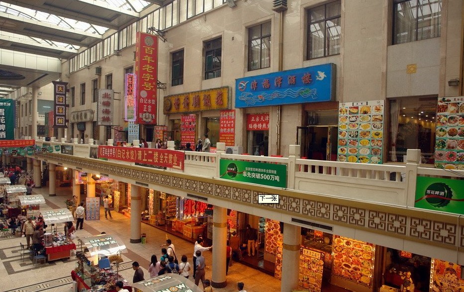 地道的风味茶汤,随着电视连续剧《龙嘴大茶壶》的播出,名噪四海,吸引了不少游客。看着祖传几代的马记茶汤师傅冲水时独特而优美的姿势,细品着热气腾腾的茶汤,真是一种地方文化的享受。来自鲁迅家乡的咸亨酒店,店堂布置讲究、文雅,悬挂的“太白遗风”匾额,配有“绍兴美酒名扬四海,古越烹调香飘九州”的对联,飘溢着浓厚的绍兴乡土气息,使你仿佛已闻到醇厚的酒香,尝到鱼嫩肉鲜的佳肴。上层则是一家家风味正宗、名声遐迩的饭庄。“得月楼”是苏州风味的饭庄,正宗的名菜“松鼠黄鱼”、“得月鸡”……其烹饪手艺的高超,味道的醇正,真可与苏州观前街的名厨高手相媲美。隔壁的“华林酒家”,是山东风味的酒楼,不但菜做得好,服务也极为热情。天津食品的“三绝”—狗不理包子、耳朵眼炸糕和大麻花,始终是本地和外地游客竞买的热门货,往往要排起长长的队伍。此外,天津崩豆张、果仁张、小宝栗子的食品也很有特色,他们炸、崩、烤的各种干果仁、豆类,不仅香口,而且还可以治病,具有降血压、降胆固醇等多种功能。