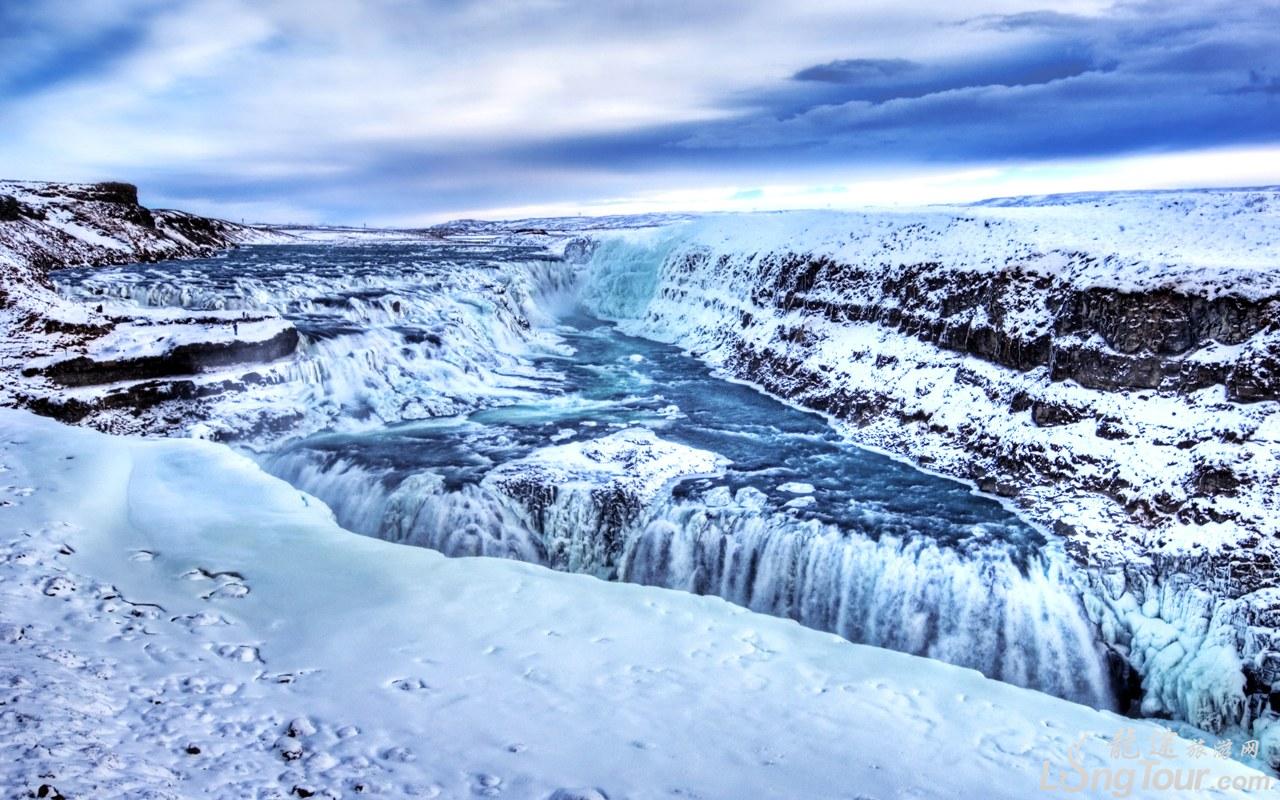 下车时只隐隐听到水声。等走到高坡的尽头,才发现自己站在悬崖边上,下面不是峡谷的瀑布。那奔流的瀑布,呈梯级分布,没有很高的落差,最高只有11米,但它有几十米宽。水声轰鸣,峡谷上笼罩着一层薄薄的水雾。因为是冬天,我们看到了连冰岛人也少见的景色。往下游倾泻的瀑布两侧,冻成了晶营透亮的淡蓝色冰柱,恰似一幅幅天然玉雕。由于那冰柱是在流动中形成的,极富动感,层次鲜明。