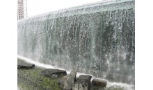 广州火车东站及其广场位于新城市中轴线的北段,东站绿化广场以大面积的绿地营造了一个大尺度的环境空间效果,配以精致的花坛、雕塑、水景,体现了广州现代化国际城市的都市风采。长89米、高8米的玻璃墙构成了水景瀑布的依托,流水从高平台溢出,顺玻璃墙泻入水池,各色灯光不断变幻将瀑布映得五颜六色。