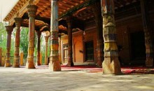 默拉纳额什丁墓在库车新老城之间。默拉纳是圣人后商的意思。额什丁相传为伊斯兰教之始祖,在宋理宗时来库车传布伊斯兰教,死后葬此。建有祠宇、分祠门、祠堂、墓门和墓室四部门、全部以绿色琉砖装饰,是曲型的伊斯兰教建筑,颇为壮丽。祠西廊下有匾额,上书 “天方列圣”四个大字。