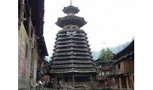 地坪风雨楼 这是贵州省最大、造型最美的风雨桥。长达50多米的地坪风雨桥始建于清光绪二十年即公元1894年,1959年毁于火灾,1964年重建。整座桥不用一钉一铆,而运用杠杆力学原理,将大小不一的柱、枋、檩、凳、栏杆等全部用杉木凿榫穿枋构成。桥体为长廊式木结构,桥上有一大两小共三座桥楼。居中的大桥楼是鼓楼式建筑,两边的桥楼皆为三层重檐双斜面屋顶。