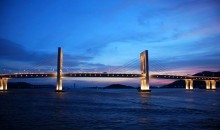 友谊大桥澳门“友谊大桥”,工程原称新澳氹大桥,1994年初建成通车。位于旧大桥(嘉乐庇总督大桥)以东,连接澳门半岛新口岸水塘北角(外港码头处)与氹仔北安码头。桥宽15米,设两条双线车道,中设分隔线,车道两旁设1.5米宽的行人道。