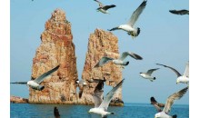 石帆礁海拔204米,是庙岛群岛的最高点,如同巨大的龙角从大海钻出,直刺云天,山顶上鸥鸟盘旋、奇石林立,岛周围洞、礁、奇石遍布,并列矗立的姊妹峰巍然不动,在风浪的烘托之下,远远望去酷似激流勇进的风帆。