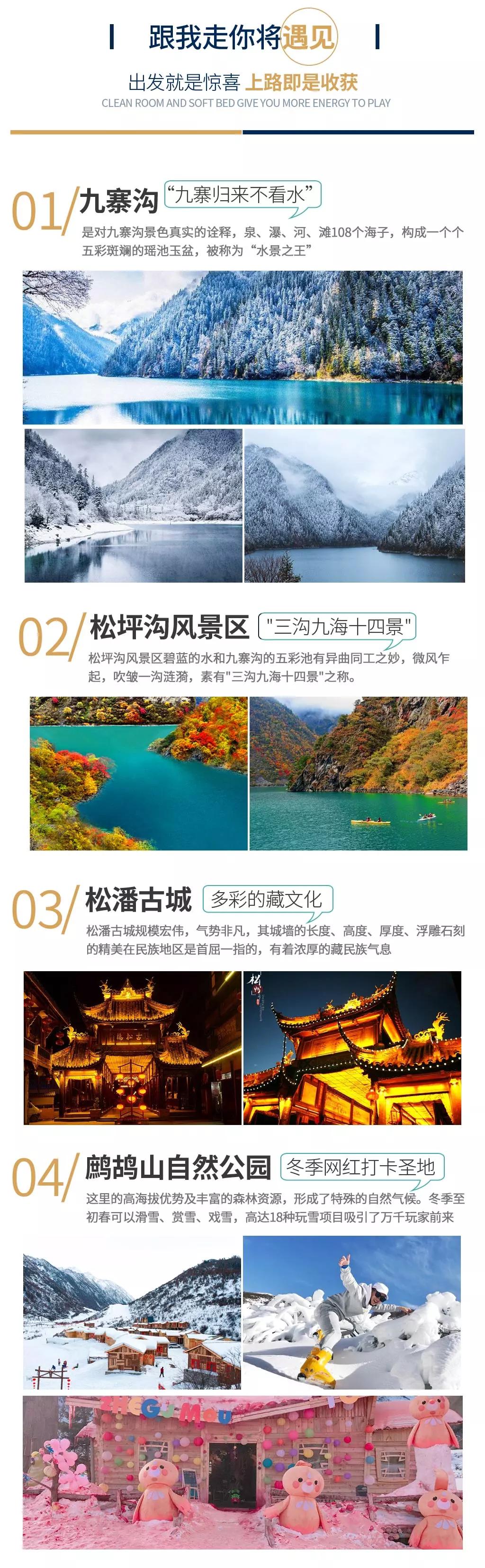 当日行程:九寨沟得名于沟内有九个藏族村寨,以“九寨六绝”——翠湖、叠瀑、彩林、雪峰、藏情、蓝冰而闻名天下。远望雪峰林立,白雪皑皑;近看碧水澄澈,清可见底;除却如梦似幻的自然景观,还有藏家木楼、晾架经幡、栈桥、磨房、藏族习俗及神话传说构成的人文景观,也因这不二的美,你能在这里见到许多热门影视剧里的取景场地。冬季的九寨沟变得尤为宁静,也更具诗情画意,山峦与树林银装素裹,瀑布变成了一幅幅巨大的天然艺术冰雕如此洁白而高雅的世界,错开拥挤的游人,却能收获一个观赏九寨六绝之“蓝冰”和“雪峰”的最好时机。