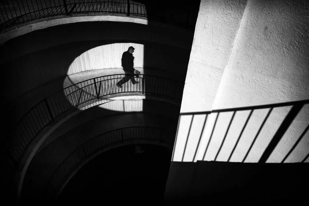 黑白色调让环境题材的形状、线条和模式更分明地呈现出来。比如,楼梯的台阶、玻璃地板、斑马线等,这些都是我们平日里常见的建筑物。