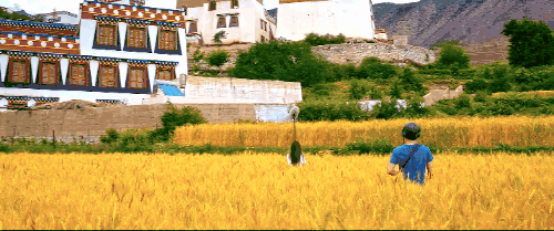 村落、河流、桦树、青稞田、寺院,这里就是一幅旖旎的田园山水画。每年9、10月,金灿灿的树一列排开。