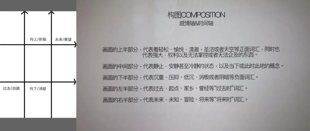 1.画面中下-中-上/左-中-右的方向轴(以及由此构成的不同区域空间),既是视觉观看(基本)的时间顺序轴,也是视觉心理的情绪变化轴。