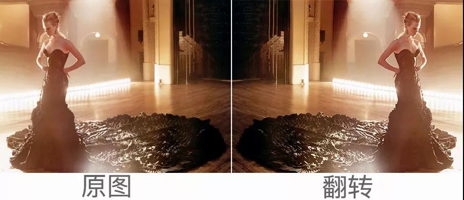 人物面部朝左,视觉情感倾向是忧郁内敛的,配合低头的姿态,仿佛有一种回顾往昔、自我勉励、积蓄力量以面对未来挑战的感受。无论是礼服的色彩还是远景处的黑色部分都非常贴合这种情感联想。反之,翻转后则被削弱了。并且由于右边空间的压缩,使人物产生一种畏缩、抗拒未来的感觉。