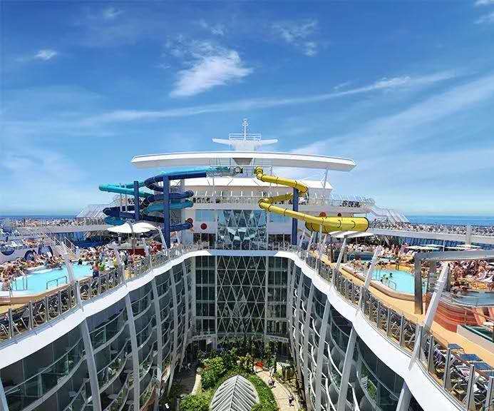 像皇家加勒比的海洋绿洲号,长约360米,宽约47米,吃水线以上高约65米,共16层甲板,而邮轮最低层甲板在五层