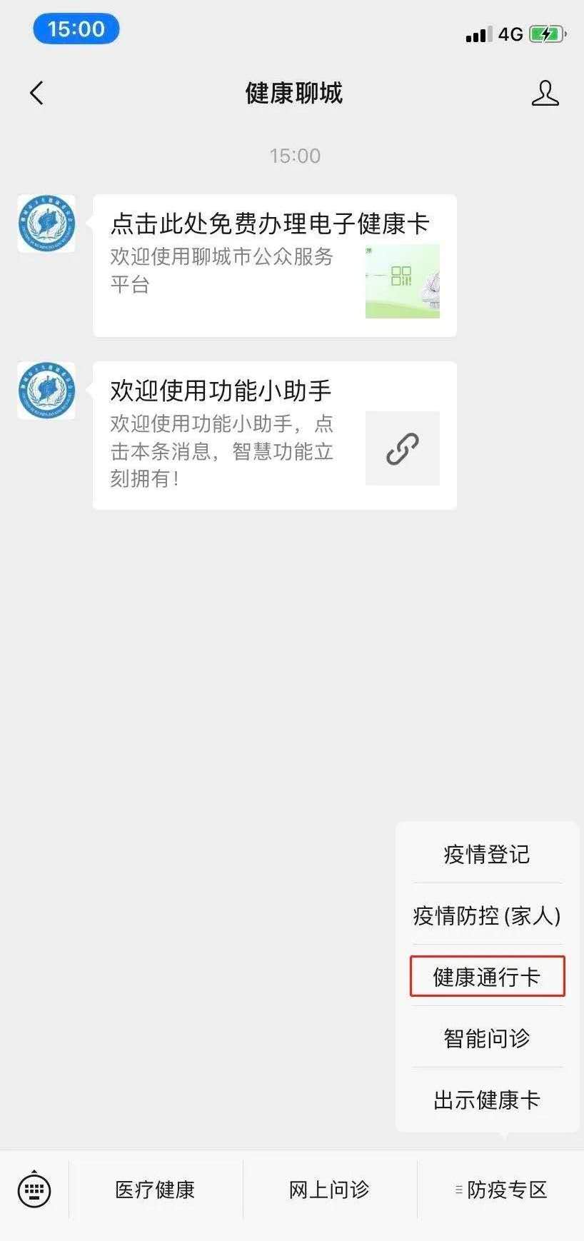 点击“防疫专区”栏目,选中“健康通行卡”