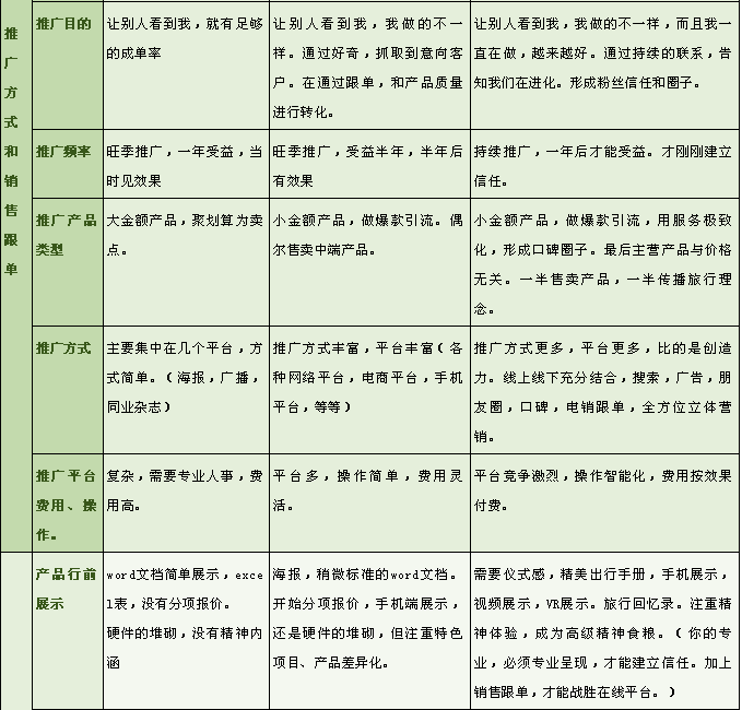 2、怎么做?如何打造口碑圈:需要市场推广,销售跟单,行前、行中、行后服务升级,产品升级,全方位立体化的营销。除此之外,别无他法。