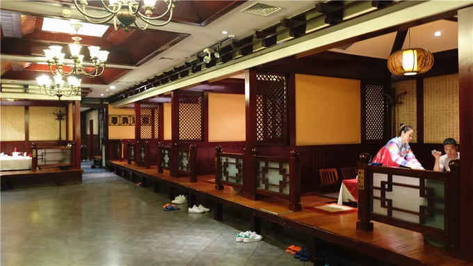 这个饭店里的陈设和布局,都是有着鲜明的朝鲜特色的,墙纸、挂饰、装修调调暖色而浓重。