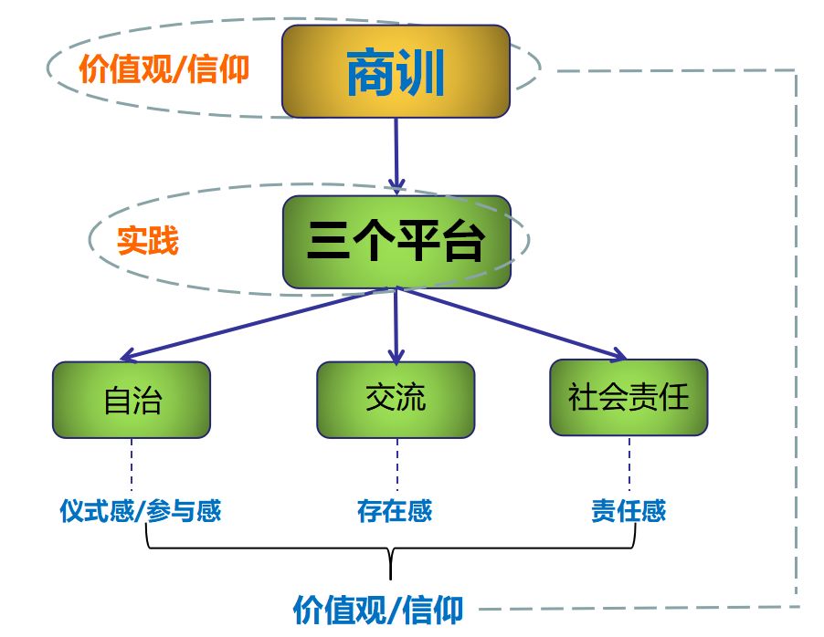 商训和商会“三个平台”的关系,即价值观和实践层面是相互印证、相辅相成的关系。价值观是靠“三个平台”上的一系列工作为参与者带来的仪式感、参与感、存在感、责任感等一系列“感觉”日积月累出来的,否则只能成为空洞的口号。