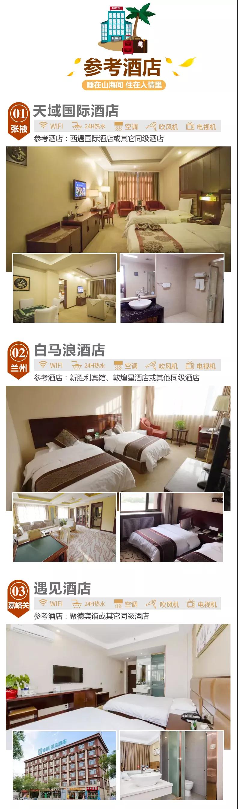 兰州:白马浪酒店、新胜利宾馆、敦煌星酒店或其他同级酒店