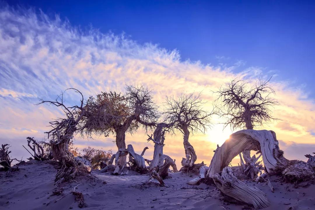 随后我们游览约一小时【怪树林】,这里几十年前是一片原始森林,由于水源不足等自然因素,大面积的胡杨树木枯死。如今,枯木东倒西歪,神态各异,因此当地人称之为怪树林。我们将在怪树林欣赏大漠落日,看滚滚落日从地平线上姗姗落下,形态各异的枯枝在大漠上画出蜿蜒的影子。