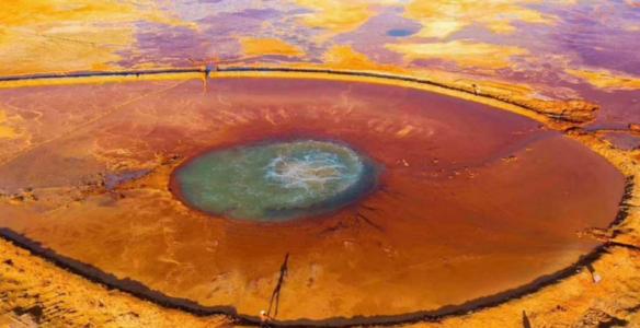 随后我们前往阿拉尔草原深处去探索一方汩汩喷涌了上千年的地热喷泉——【“恶魔之眼”艾肯泉】。“艾肯”在蒙语中意为“可怕”,而“艾肯泉”在蒙语中又意为“源头”,因其湖水成分艾肯泉周围寸草不生且形成了一个红褐色的圆形,正中央便是汩汩而出的泉水,这便形成了一个巨大的“眼睛”,被人称为“大地之眼”。从空中俯瞰航拍,这巨大的眼睛脉络清晰,栩栩如生,在它周围点缀着许多青色的小泉眼,神秘而震撼;除了其令人惊奇的血色眼睛造型,艾肯泉还有神奇的“喊泉”属性,据说站在岸边朝它大喊,或者是在岸边跺跺脚,喷泉口的水流量就会加大,会喷涌得更高。