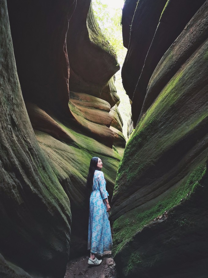 其中,沿着栈道走到最下面左转的闫家寨附近的水面在修码头以后会有游船,右转是所谓的一线天,到入口看了下里面很狭窄,加上雨季可能有落石不太安全就没有进入。这部分的特点是在峡谷底部的行走,景色没有水上丹霞好。
