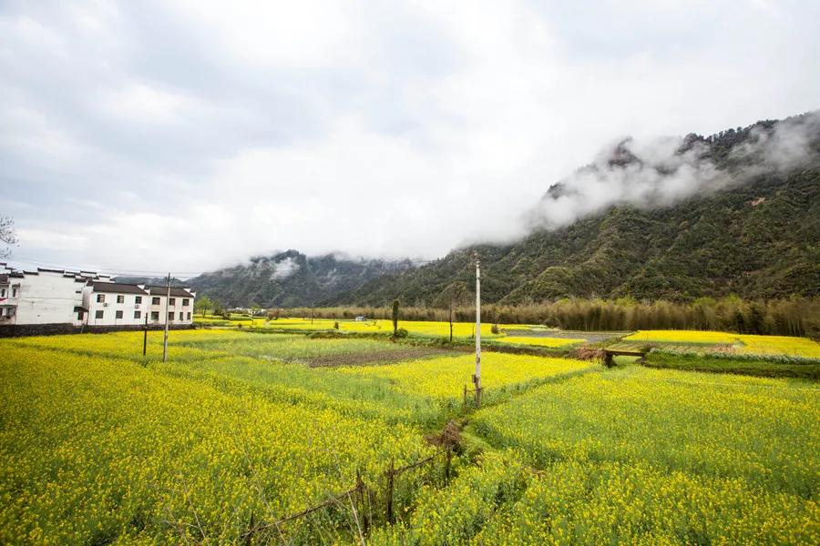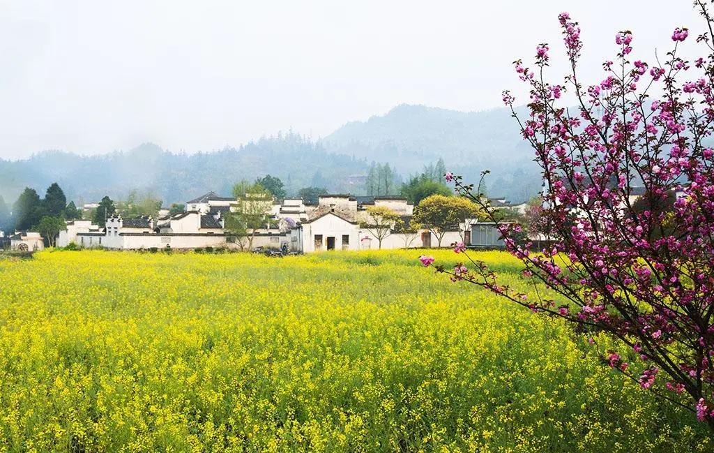 粉墙黛瓦的徽州古民居点缀于广阔的油菜花丛中
