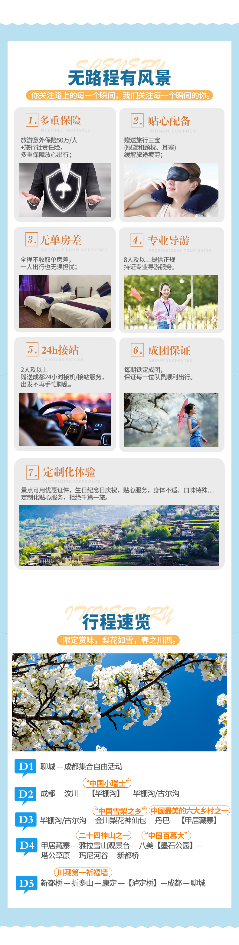 1、关于车辆交通:目前四川旅游市场8座以下车辆无法办理旅游牌照,请游客知悉,以此理由提起的投诉我方拒不受理,望您谅解。