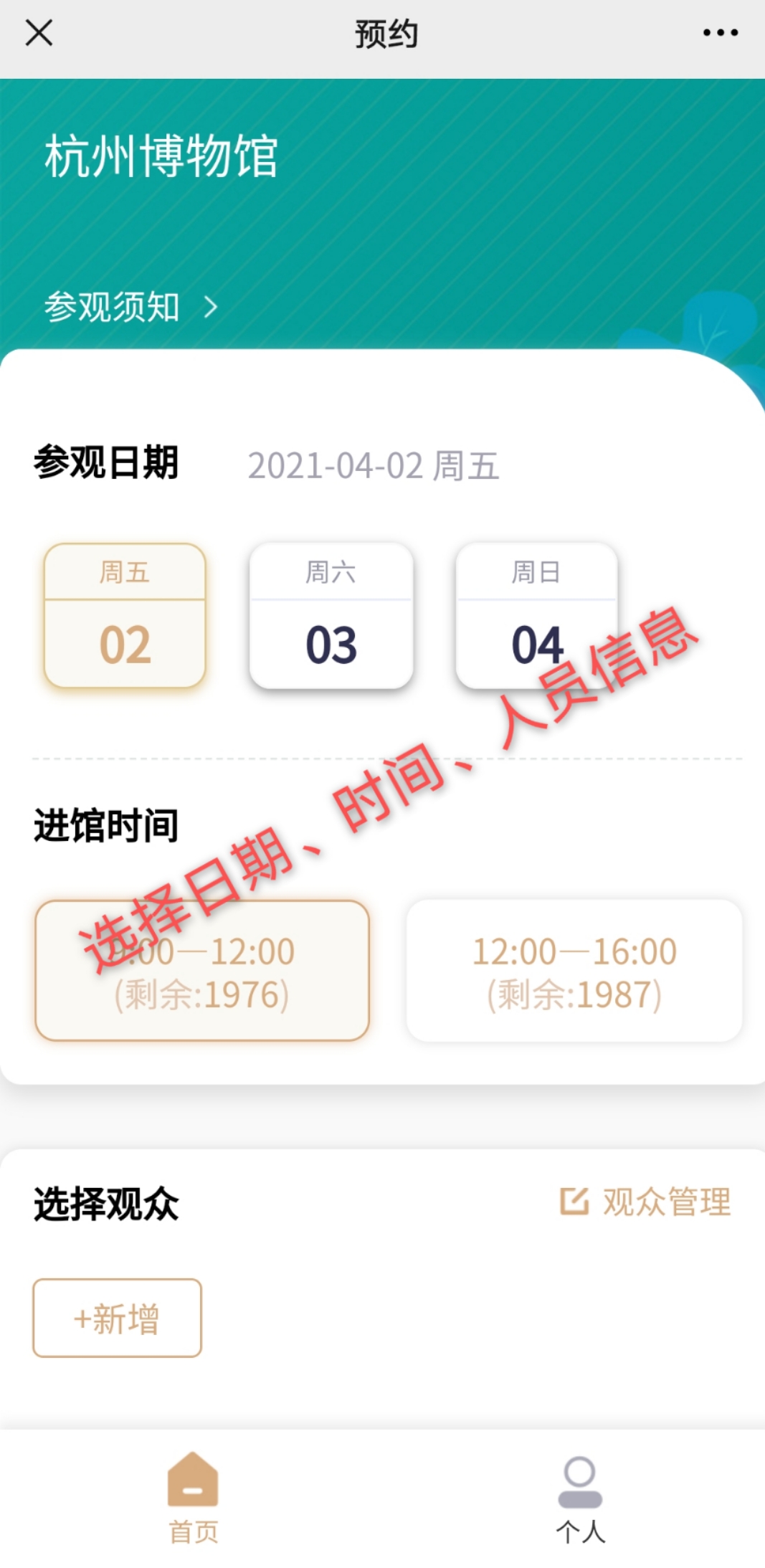 1.我馆实行分时段实名预约参观,观众进入“杭州博物馆”微信公众号,可提前3天预约。预约时段分为:9:00-12:00,可预约人次2000;12:00-16:00,可预约人次2000。