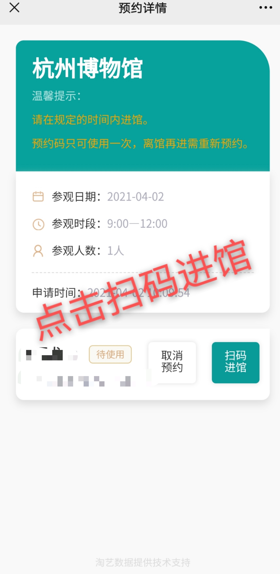 2. 每张有效身份证件每个时段限约1次,每次可预约5人。请务必截屏保存预约二维码(也可通过微信预约界面进入个人->我的预约->查看获取预约二维码 )。观众到馆后通过刷二维码或预约的身份证过闸检票进馆。